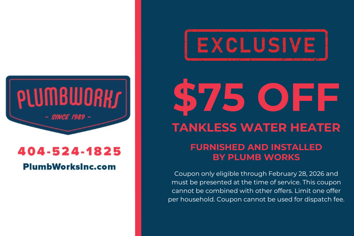 Save money and add value to your next plumbing project with Atlanta, GA’s best plumbing coupons and specials from Plumb Works Inc. Call 404-524-1825